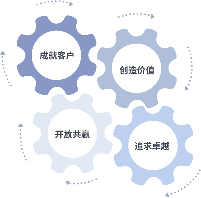 成就客户是一切决策的出发点,,创造价值是衡量所有工作的标准,,,追求卓越是我们做事做人的态度,,,开放共赢是我们的格局也是最终的结果。。。。价值观的齿轮环环相扣,,,推动着组织里的每个人不断向前。。。。