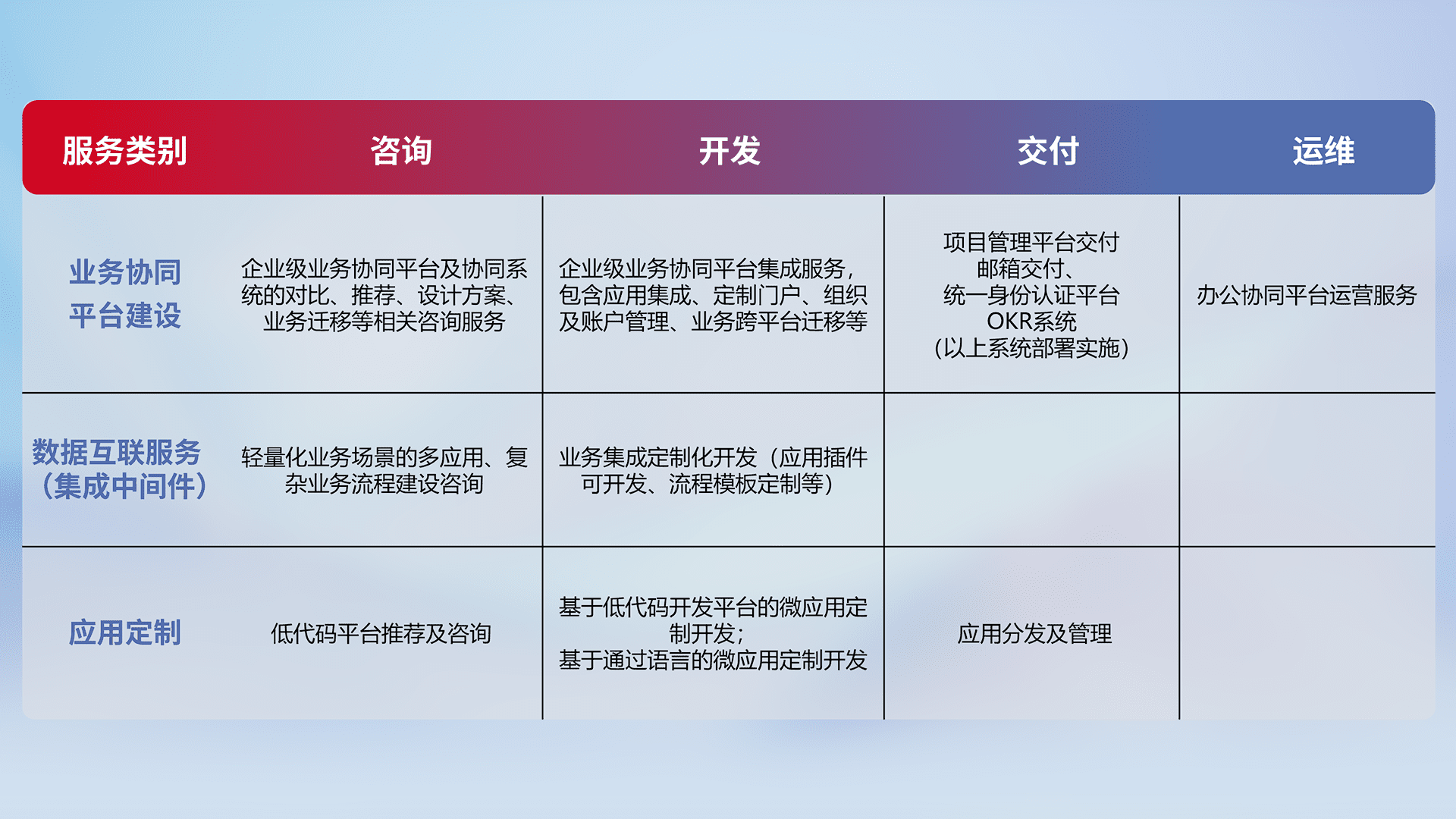 针对钉钉、、企微、、、IDaas等平台级产品提供产品的规划、、、方案、、交付、、、、定制化开发等服务,,,,实现如统一协同办公、、智能客户服务、、、混合会议管理、、智能数据查询、、、等业务场景,,,实现数字化转型。。。。